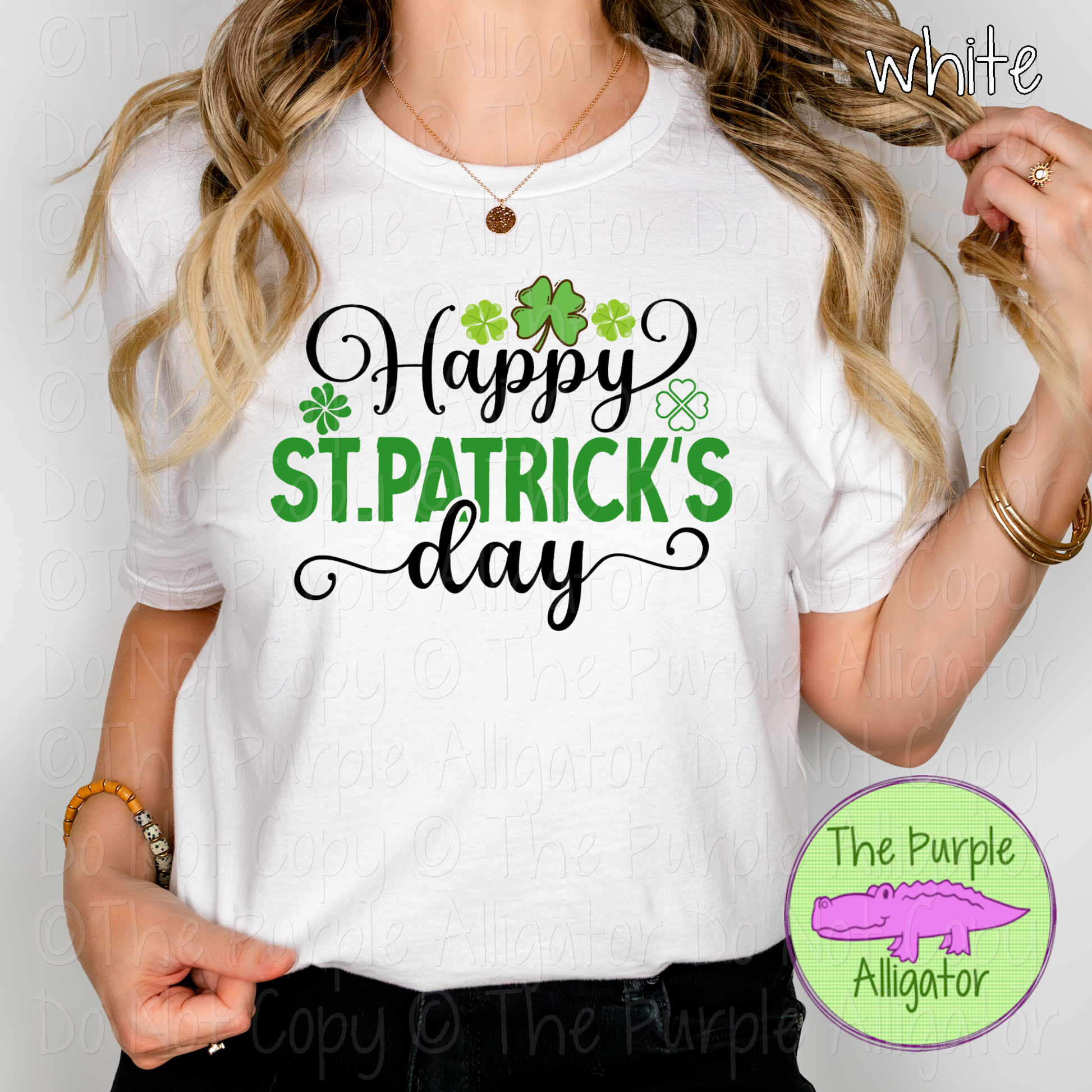 “Happy” and “Day” appear in black script, framing ST. PATRICK’S in bold Kelly green lettering. Small four-leaf clovers add a festive touch without overpowering the design.